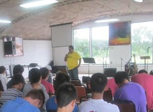 Pastor David shown here speaking during our Team Ministry chapel service at Camp Getsemani in Acuña |